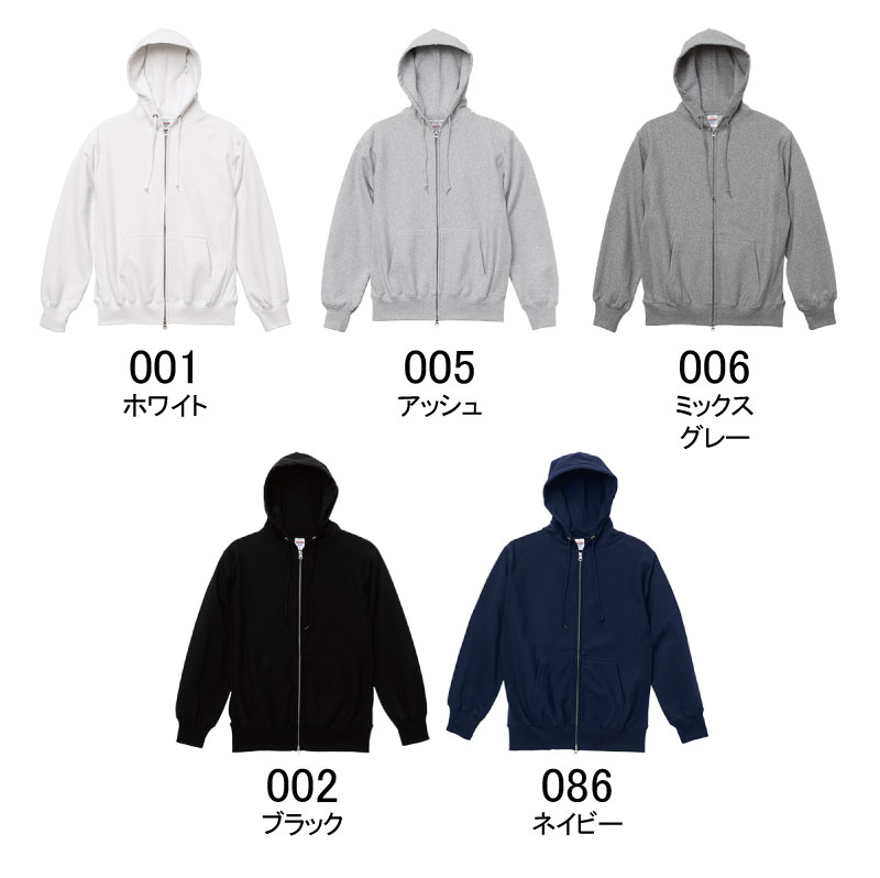 素材:綿 75%、ポリエステル 25% 裏起毛(表面:オープンエンド糸) ミックスグレー:綿 65% ポリエステル 35%(混紡糸) ※生地目は横取り ※ファスナーはYKK社製 ダブルスライダー ※フードひもは丸ひも身頃同色