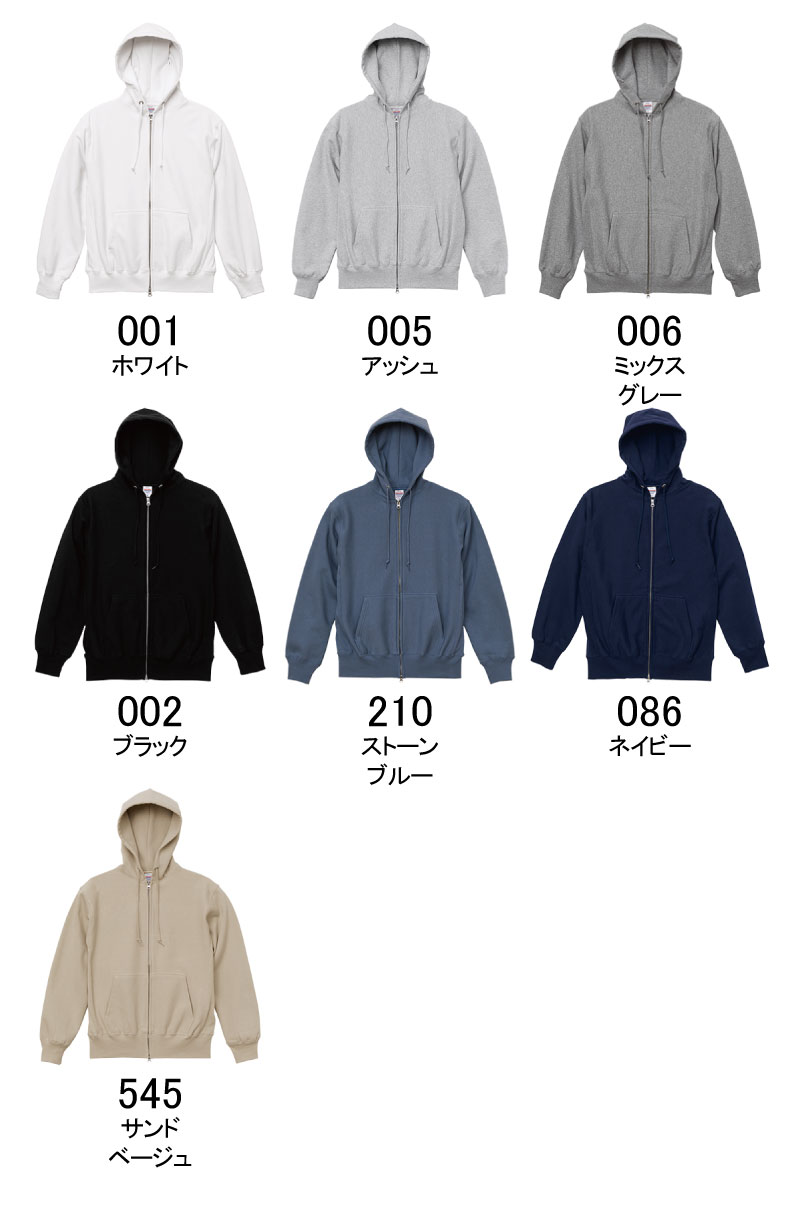 素材:綿 75%、ポリエステル 25% 裏起毛(表面:オープンエンド糸) ミックスグレー:綿 65% ポリエステル 35%(混紡糸) ※生地目は横取り ※ファスナーはYKK社製 ダブルスライダー ※フードひもは丸ひも身頃同色